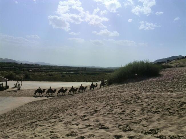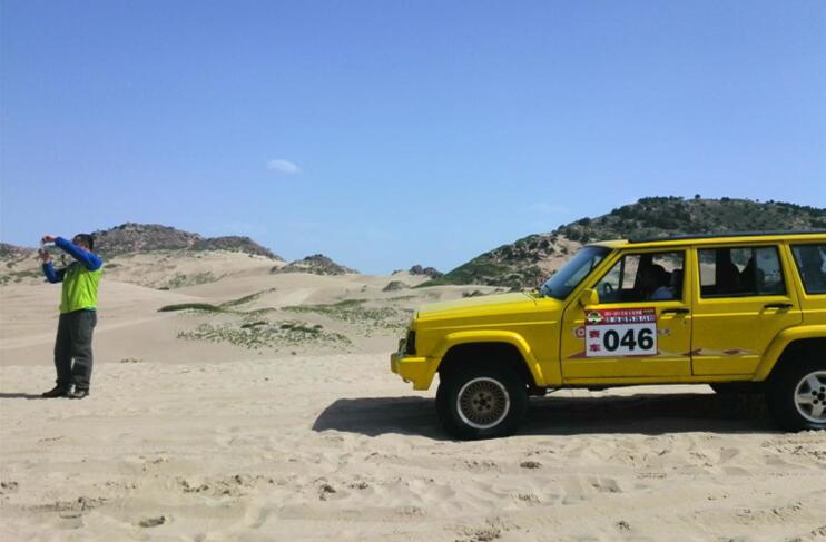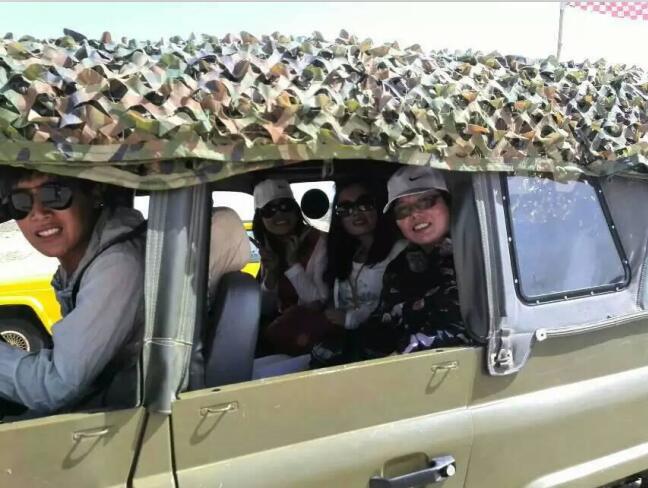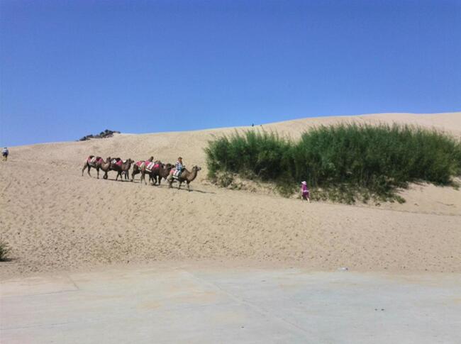 車子駛進(jìn)玉龍沙湖的停車場(chǎng),我的思緒由漫漫歷史回到眼前景色。小小的一個(gè)湖,大大的看不到邊際的沙漠。據(jù)說(shuō)這就是歷史上有名的科爾沁草原,現(xiàn)在也只能叫科爾沁沙地了吧。湖水的面積越來(lái)越小,湖水周圍一片小小的綠洲,綠洲外圍就是望不到邊際的沙漠。在我們出行前,旅行社的對(duì)這里的描繪是這個(gè)樣子:“讓您感受茫茫大漠、沙丘滾滾,連綿起伏的雄渾與壯美,金黃色的沙坡掩映在藍(lán)天、白云下,有一種茫茫沙海入云天的壯麗景象。觀賞陰石、陽(yáng)石、石長(zhǎng)城等沙漠奇觀,體驗(yàn)夢(mèng)幻沙漠所帶來(lái)的無(wú)限驚奇!边@里說(shuō)說(shuō)的我的實(shí)際感受:沙子很白很細(xì),光著腳踩上去很燙,爬到沙坡上面,我的腳已被燙的發(fā)紅。站在沙坡上面遠(yuǎn)望,沙丘滾滾,連綿起伏是真實(shí)場(chǎng)景,但是我卻不能和雄渾、壯美等詞匯聯(lián)系在一起,也許是受后邊幾日景色的干擾,也許是在港城海邊也有很多沙地的原因,沙地并不算這幾天旅行中的美景。在玉龍沙湖的游覽中有兩點(diǎn)最記憶猶新:越野車和兩部電影的外景地。這里有兩個(gè)自費(fèi)項(xiàng)目,越野車和騎駱駝,我選擇了越野車。交了錢分了組后,我和馬姐、小費(fèi)、小霍四人一車,聽(tīng)導(dǎo)游說(shuō)越野車很怕人,那三人就一下做到了后排,我只好做到副駕駛位置。記好安全帶后,司機(jī)帶我們沖進(jìn)沙漠深處,一開始道路還算平緩,我們的心也是平緩的,坡度逐漸陡峭起來(lái),后排三位的叫聲也越發(fā)尖銳,突然一個(gè)幾乎90度的坡沖下,車子似乎好像失去了重力,直接下去了,后排三位女士的聲音已經(jīng)不只尖銳了,近乎聲嘶力竭,我坐在前排,可能是能看到下邊的原因,并沒(méi)有覺(jué)得如此可怕,只是覺(jué)得很爽。越野車就這樣起起伏伏的狂奔了20分鐘又回到了遠(yuǎn)點(diǎn),驚險(xiǎn)刺激,對(duì)的起120元的價(jià)位。這里是電影《萬(wàn)物生長(zhǎng)》和《后會(huì)無(wú)期》的外景地,《萬(wàn)物生長(zhǎng)》中范冰冰和韓庚的激情戲就是在這片沙子中拍攝的,就沖這個(gè)我也要光腳在沙堆上走一走;據(jù)劉繼偉說(shuō)他看到了《后會(huì)無(wú)期》中的那顆衛(wèi)星,我卻已經(jīng)走累了,不去再看那顆衛(wèi)星了和大伙坐在山地旁邊的亭子里休息,順便看看別人騎駱駝。不到4點(diǎn)的功夫我們都已經(jīng)從景區(qū)出來(lái)了,坐車去往翁牛特旗的旗政府烏丹吃飯休息。